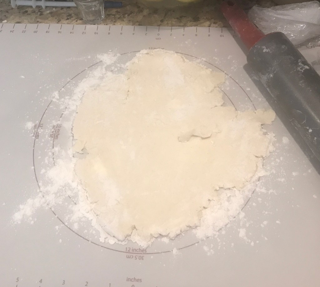 Well, friends, I planned to be flexible. This time, when I made the crust, I reminded myself that it wasn’t going to be like a wheat crust, where you can stretch it to a thin window pane. I reminded myself that the crust was going to fall apart before it even makes it into the pie pan and that piecing together the crust is no moral failing on this pie baker. I didn’t put it in the fridge for very long because I remembered last time, after the butter chilled, it was way too hard to roll it out. And finally, I adjusted the amount of water I added. I adapted.